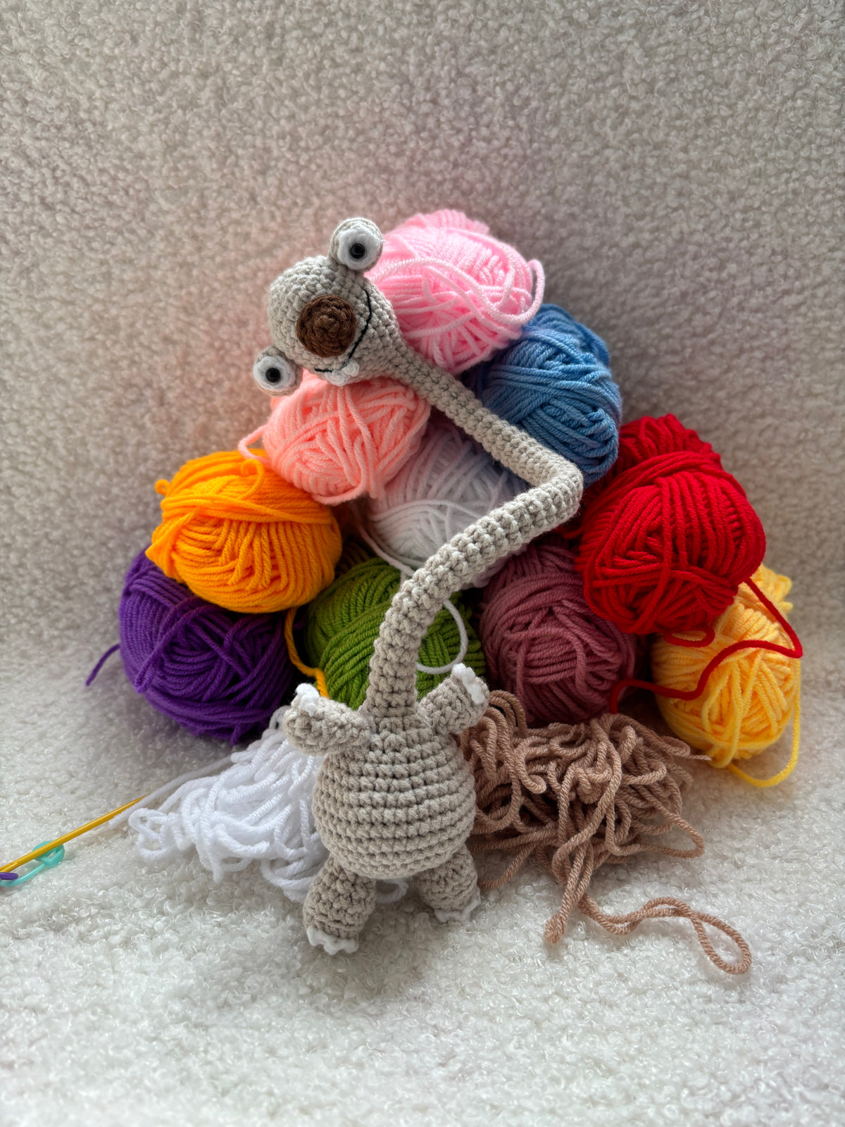 Meet our handmade Prehistoric Sloth amigurumi! With its endearingly goofy expression, long neck, and clumsy-cute posture, this little sloth is designed to bring a smile to your face. Whether it's hanging from your favorite bag or keeping you company on your desk, this one-of-a-kind companion is ready for any journey.